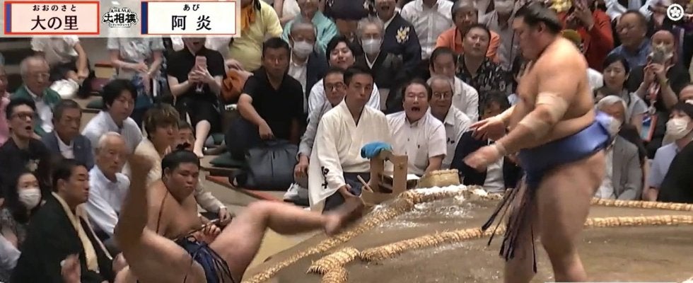 大の里が阿炎を吹き飛ばした衝撃的なラストに、視聴者も「こんなん交通事故やん」「160キロをふっ飛ばすパワー」「これが横綱ですよ」「強すぎ!」「恐ろしいな」「曙の再来だ」「合気道みたいに飛んだな」と驚嘆の声を上げていた。(ABEMA/大相撲チャンネル)