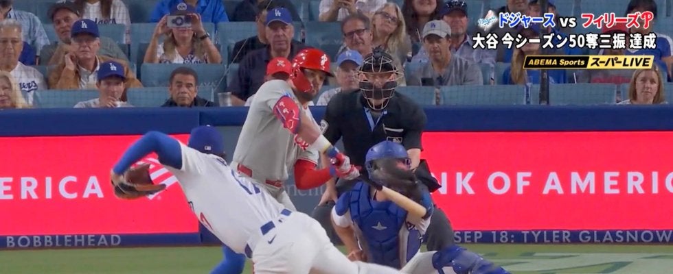 この日の大谷は5回を投げて68球、被安打0、与四球1、5奪三振、無失点と快投。さらに打っては50号を放ち、メジャー史上初の「50本塁打50奪三振」という前人未踏の数字を刻んだ。初回のシュワーバーとの真剣勝負は、この日の快投を象徴する迫力のシーンとなった。(ABEMA『SPORTSチャンネル』)