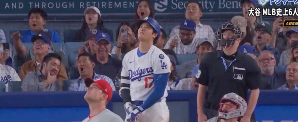 すると打球は快音を響かせながら、ライトスタンドへと一直線。打球速度113.4マイル(約182.49km/h)、飛距離430フィート(約131.06メートル)と、文句なしの高速豪快弾となった大谷の今季第50号、ボール球を狙い澄ましたように運ばれたとあってよほど想定外のことであったのか、打たれたロバートソンは、即座にマウンド上で棒立ち状態となり、瞬く間にスタンドへと吸い込まれていく打球をただただ見送ることとなった。こうした大谷の豪快すぎる一発と、ロバートソンの被弾リアクションにファンからは「泣きそう」「絶望してる」「呆然w」「完全に狙ってたなw」「無慈悲すぎる」「悪球打ちすぎるw」「ピッチャー的になんで打った?だろw」といった様々な反響が巻き起こることに。