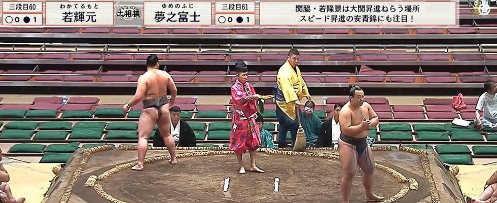 三段目六十一枚目・夢之富士(伊勢ヶ濱)と三段目六十枚目・若輝元(錣山)の一番での一コマ。四股名を呼び上げられて土俵に上がった17歳の若手力士である夢之富士は、通常は向正面の白房下に向かうところ、うっかり正面の黒房下へ。気づいた夢之富士は「あ、しまった!」というリアクションを見せると、大慌てで所定の位置へと移動、赤面するように照れた表情を浮かべていた。
