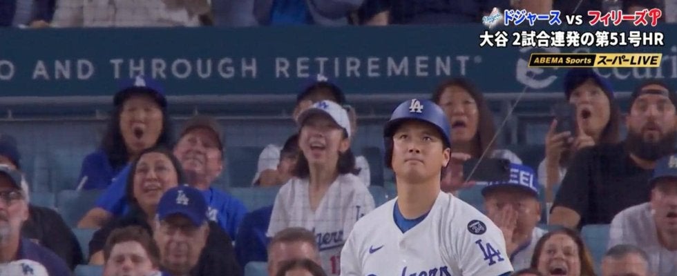完璧な一打を放ったヒーローの表情をカメラが見逃すわけがなかった。ドジャースの大谷翔平投手がフィリーズ戦に「1番・DH」で先発出場すると、第4打席で今季51号目となる本塁打を放った。本塁打王争いのライバルであるシュワーバー内野手の目の前で2本差と迫る一打を放ち、そしてチームの勝利を確実とするダメ押しの一打だったことで思わず見せた表情が話題となった。
