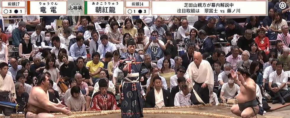 この取組の前に3勝目を挙げた前頭十八枚目・獅司(雷)が力水をつけた直後、偶然カメラが捉えたのは両肩がざっくり開いた黄色いワンピース姿の女性の姿。ABEMA実況の清野茂樹アナが「今日は暑いですからね。やっぱり今日は薄着のお客様がたくさん」と話すと、解説を務めた芝田山親方が「いつもネクタイぶら下げてくるんですけど、半袖のシャツで、ネクタイなしでジャケットも着るのやめようかなと思ったんですけど…ここ(放送席)ちょっと涼しいのでジャケットだけ着ましたけど」と応じた。
