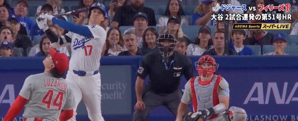 そうして迎えた8回裏。この回の先頭打者として打席に入った大谷はフィリーズ先発のルサルド投手と対戦すると、カウント2ー2からルサルドが投げた143キロのスライダーをフルスイング。打球はあっという間にセンターバックスクリーンやや右側に着弾する完璧な一打でダメ押しとなる第51号ソロ本塁打を放った。