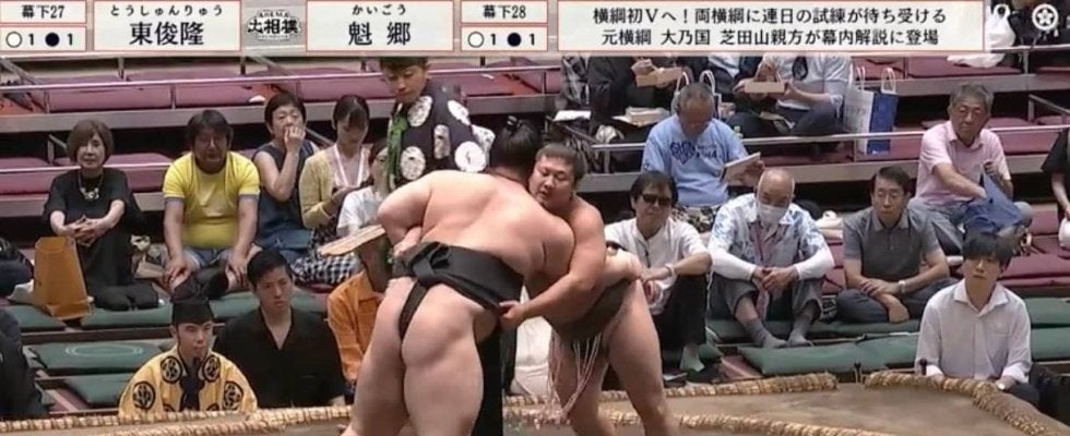 幕下二十七枚目・東俊隆(玉ノ井)と幕下二十八枚目・魁郷(浅香山)の一番。立ち合い鋭く突っ張っていった東俊隆に対し、負けじと突き返す魁郷。魁郷が前に出ると東俊隆はひらりとかわし、激しい攻防を繰り広げていった。
