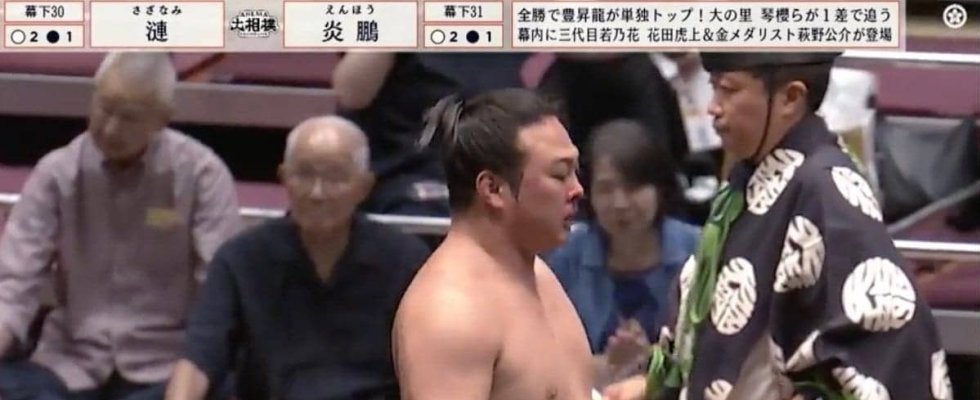 しかし、炎鵬はそのまま土俵へと倒れ込んでしまった。決まり手は切り返し。漣は3勝目、炎鵬は2敗目を喫した。