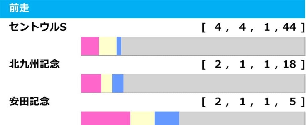 成績をみると、前走セントウルS組の4勝が最多。以下、北九州記念、安田記念組の2勝と続く。しかし今年はその二組からの出走馬はゼロ。今回は最多勝利のセントウルS組を中心に深堀りする。