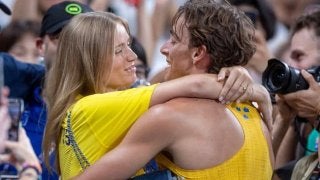 男子棒高跳びを世界新の6メートル30で制し、婚約者と抱き合うデュプランティス(C)Getty Images「東京2025…