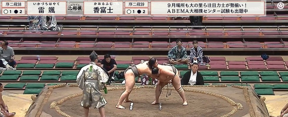 その後、長い相撲となったものの、最後はもろ差しとなった香富士が寄り切って白星。敗れた雷颯は3敗目を喫した。(ABEMA/大相撲チャンネル)