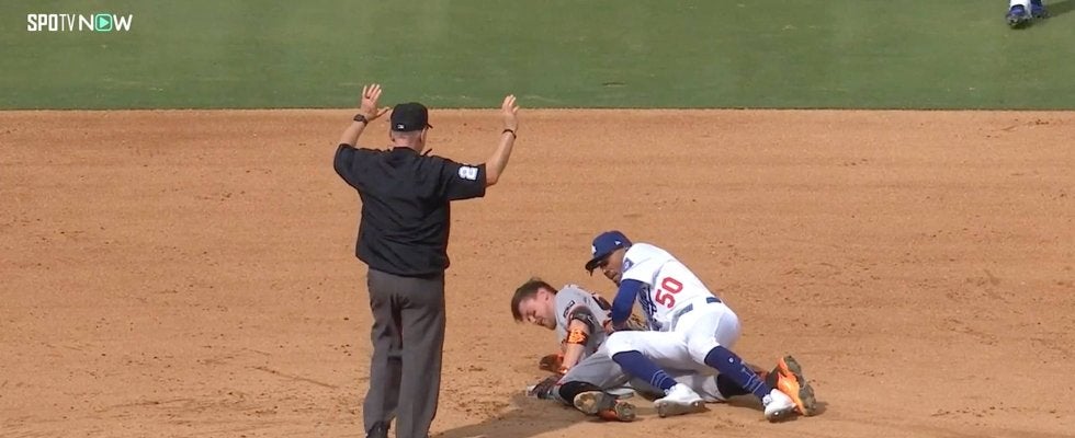 1ー3とドジャースが2点を追う9回、1死走者なしで打席に入ったのはジャイアンツのルーキー、コス。クラインの初球を捉えてセンター前に運ぶと、一塁から迷わず二塁を狙い、ヘッドスライディングで滑り込んだ。その瞬間、タッチアウトを狙ったベッツと交錯。ベッツがコスの上に乗り上げるような体勢となり、激しいプレーに観客席もどよめいた。