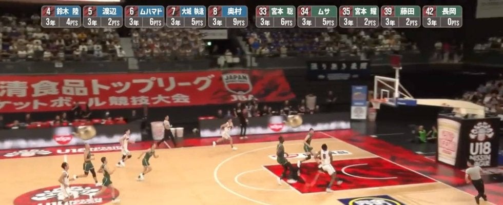 28ー24と美濃加茂がリードして迎えた第2クォーターの残り6分、ムハマドのディフェンスリバウンドから攻守が入れ替わる。大城執逢、渡辺陽翔とボールを繋いで行く間に、ムハマドは一気にペイントエリアへ。渡辺からの浮き球のパスを受けると、鋭くドライブして最後は豪快なワンハンドダンクを叩き込んだ。