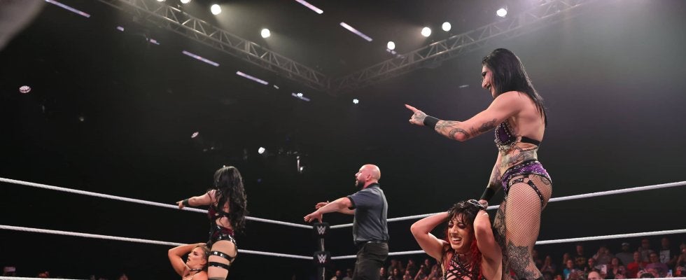 イベント名の通り、この日はNXTに縁のある「RAW」「SmackDown」のメインロースターたちも古巣の育成ブランド”NXT”に帰郷し多数参戦。6人タッグ戦では「RAW」代表のリア・リプリー&ステファニー・バッケル&ライラ・ヴァルキュリアが、NXTのヒールユニット”フェイタル・インフルエンス”(ジェイシー・ジェイン&ファロン・ヘンリー&ジャズミン・ニックス)と激突。その中で飛び出したのが、リアとステファニーによる“デビルズ・キス”の共演だった。