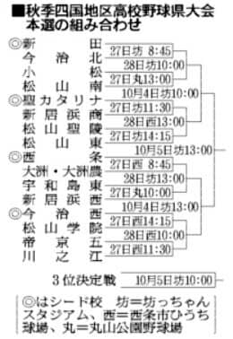 第78回秋季四国地区高校野球愛媛県大会の本選の組み合わせ抽選会が24日、松山市であった。予選を勝ち抜いた16チームが出場。各チームの投票で、新田、西条、今治西、聖カタリナの4チームがシード校に選出された。大会は27日に1回戦8試合が松山市の坊っちゃんスタジアム、西条市ひうち球場、宇和島市の丸山公園野球場であり、28日に準々決勝、10月4日に準決勝、同5日に坊っちゃんスタジアムで決勝と3位決定戦がある。上位3チームは同18日から同スタジアムと今治市営球場で行われる四国大会に出場する。(水田道雄)