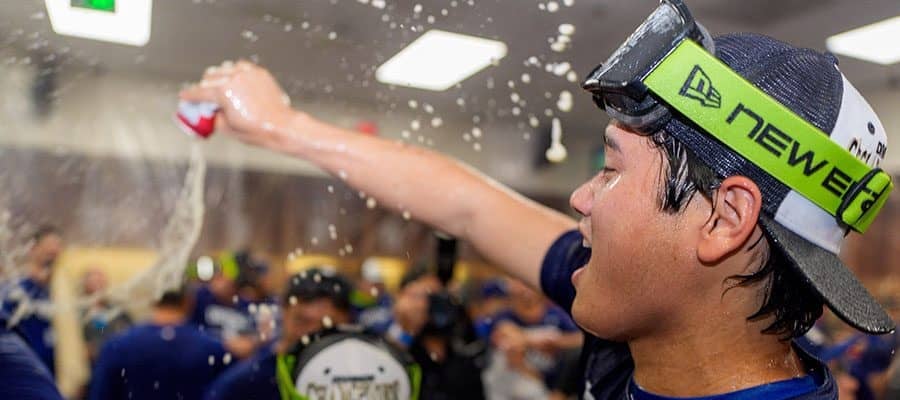 シャンパンファイトの中では、大谷らアジア出身4選手が肩を組んで記念撮影する場面が。山本はこの日6回無失点の好投を見せて12勝目をマーク。1年間ローテーションを支え、大谷も「本当にエースと思っている」と称えた。左隣の佐々木も前日にメジャー復帰。ドジャースで初めての美酒となった。また、真ん中にはキムの姿も。開幕前にはマイナーに降格となったが、メジャー昇格を掴み、左肩の負傷で離脱するまでは打率3割と好結果を残した。