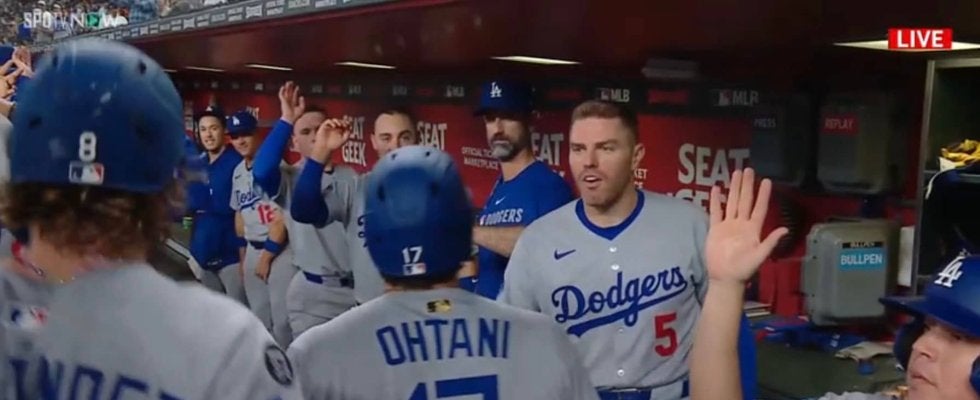 ドジャースの大谷翔平投手がダイヤモンドバックス戦に「1番・DH」でスタメン出場。キャリア最多タイとなる54号を放った直後にベンチで見せたフリーマンとの“お辞儀コラボ”がファンを沸かせた。