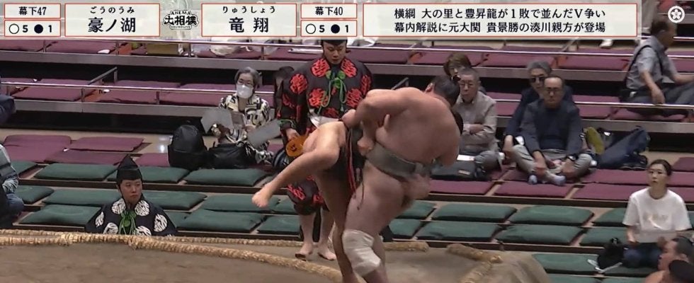 幕下四十七枚目・豪ノ湖(武隈)と幕下四十枚目・竜翔(追手風)の一番での出来事。5勝1敗同士の対決、取組は立ち合い豪ノ湖が鋭く当たって左上手を掴むも、竜翔もまわしを掴んで寄っていった。土俵際まで詰め寄られてピンチを迎えた豪ノ湖だったが、徳俵に足をかけて粘ると、鮮やかなうっちゃりを決めて逆転勝利を遂げた。豪ノ湖は6勝目を挙げ、竜翔は2敗目を喫した。