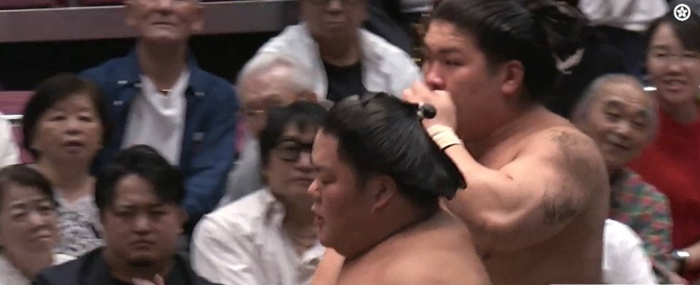 前頭十枚目・大栄翔(追手風)と前頭十四枚目・朝紅龍(高砂)の一番での出来事。埼玉栄高校出身の大栄翔は、ABEMAで解説を務めた湊川親方にとって3学年上の高校の先輩でもある。