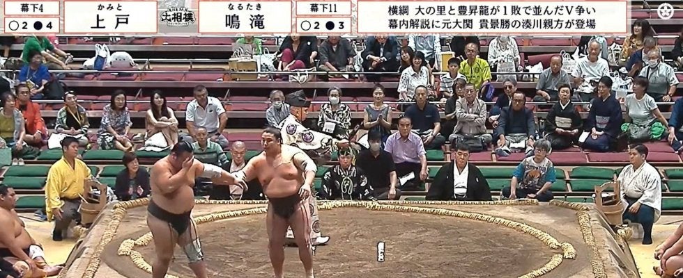 次の瞬間、鳴滝の“頭突き”が上戸の顔面にクリーンヒット。30歳のベテラン力士・上戸は思わず体を起こし、そのまま力なく土俵を割って黒星を喫した。決着がついた後も上戸はフラフラした様子で顔面を痛そうに手で押さえていた。鳴滝は心配そうに上戸を支える気づかいを見せていた。押し出しで勝った鳴滝は3勝目(1休)、敗れた上戸は5敗目を喫した。