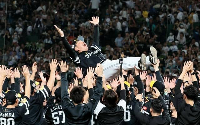 優勝を決め、選手たちに胴上げされるソフトバンクの小久保裕紀監督=2025年9月27日、ベルーナドーム、小宮路勝撮影