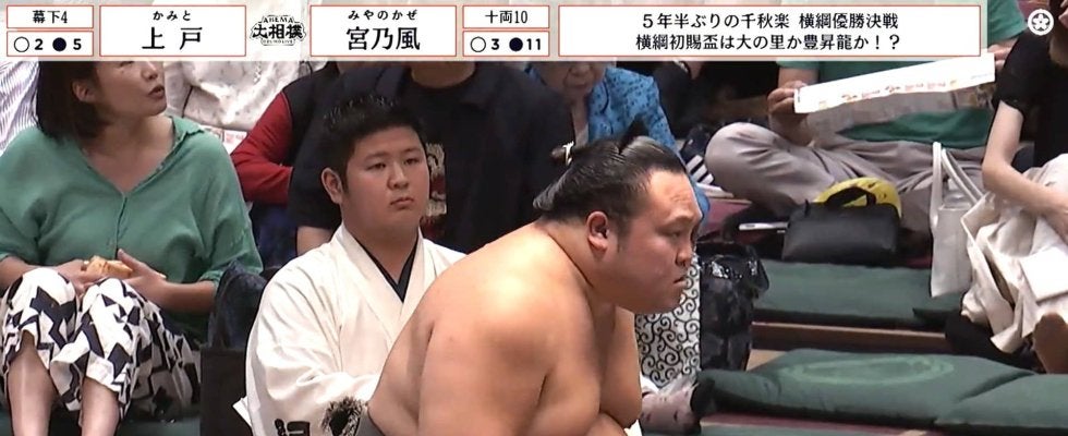 しかし上戸は千秋楽で意地を見せる。格上である十両の宮乃風に正面から当たると、圧力で体勢を崩した宮乃風をすぐさまはたき込んで3勝目を挙げた。一方、敗れた宮乃風は元気なく12敗目を喫した。