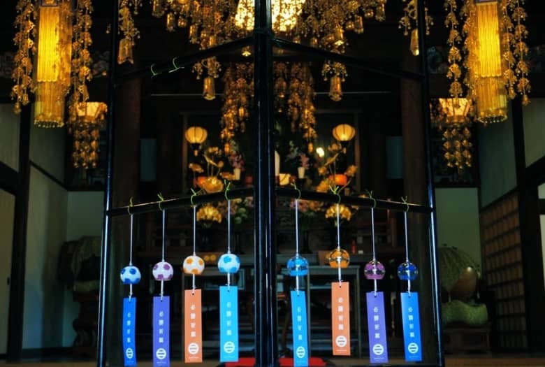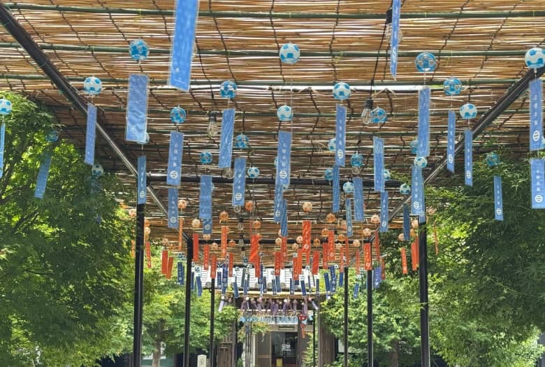 県内にある4つのサッカークラブのカラーに彩色された200個の風鈴を境内に飾り付ける圧巻の催し。普段の試合ではライバル同士のクラブだが、この日、風鈴は仲良く同じ音色を奏でながら訪れる人々を見守っていた。