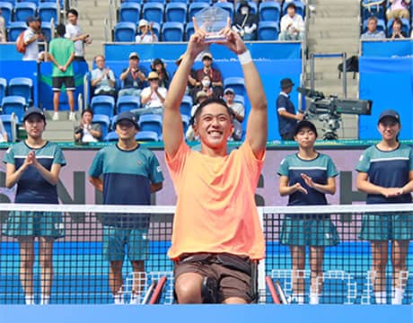 車いすテニスの木下グループ ジャパンオープンテニス チャンピオンシップス2025(日本/東京、ハード)は29日、男子シングルス決勝が行われ、第1シードの小田凱人が第2シードの荒井大輔に6-0, 6-0のストレートで圧勝し、大会3連覇を成し遂げた。表彰式で小田は「もっと強くなるので信じていてください」と語った。