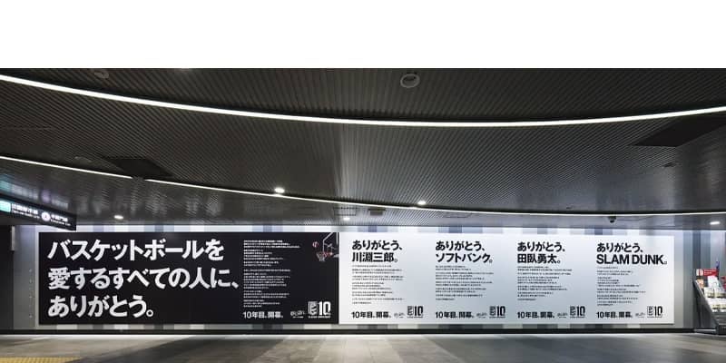 9月29日、Bリーグは開幕10周年の感謝を込め、同日より全国41都道府県とニューヨークのタイムズスクエアの合計150カ所に、100種類のメッセージ広告を掲出することを発表した。