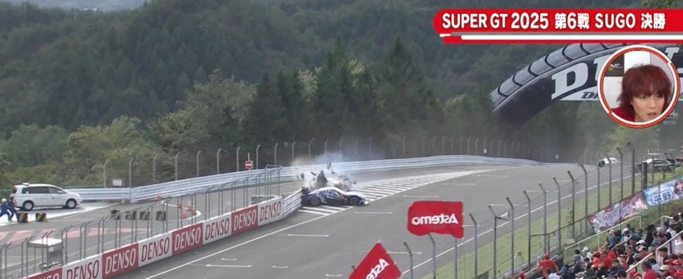スーパーGT 第6戦決勝。魔物が潜むスポーツランドSUGOで、その瞬間が訪れた。2度目のFCY(フルコースイエロー)解除直後の49周目、最終コーナー立ち上がりでGT500クラス Modulo Nakajima Racing(#64 Modulo CIVIC TYPE R-GT)と、GT300クラス SHADE RACING(#20 シェイドレーシング GR86 GT)が接触。64号車は20号車とピットレーン入口のバリアに挟まれる形となり、フロントは原形を留めないほど大破した。