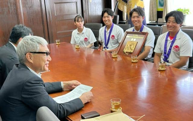 社会人野球のクラブチーム日本一を決める「第49回全日本クラブ野球選手権大会」で2年連続7回目の優勝を果たしたマツゲン箕島硬式野球部が9月30日、県庁を訪れ、宮崎泉知事に結果を報告した。