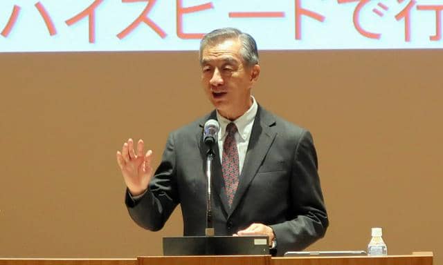 ノジマの内定式で内定者にメッセージを送る野島広司社長=2025年10月1日、横浜市西区、山口博敬撮影