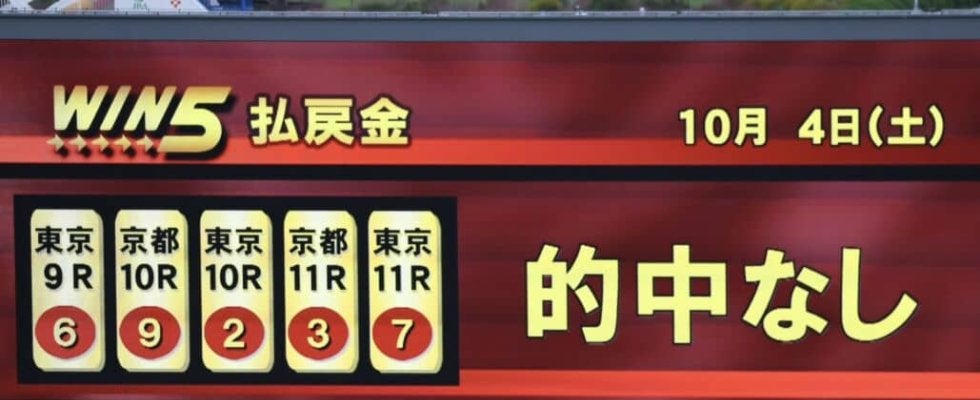 10月4日に行われたWIN5は的中0票で、まさかのキャリーオーバーとなった。1レース目から10番人気の波乱。大幅に削られてしまい、最後のグリーンチャンネルカップでは残票が3票だった。4番人気のオメガギネスが突き抜け0票が確定し、2億5706万3660円のキャリーオーバーとなっている。
