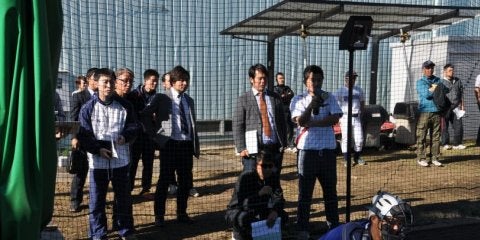 [ブルペンに設置されたRapsodo。トライアウト投手たちを解析した] 11月3日に埼玉県川越市で、四国アイランドリーグ…