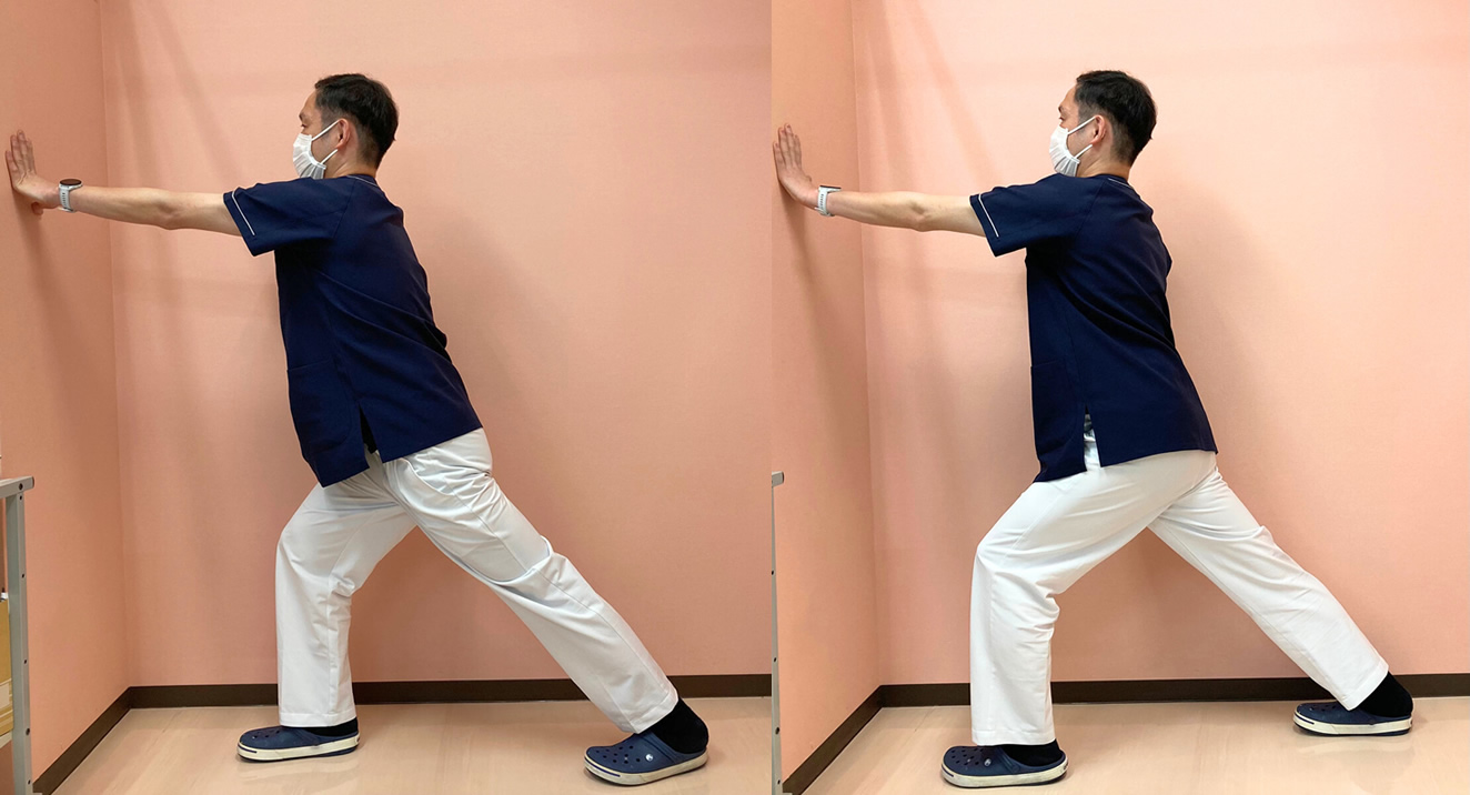 壁に手をつき、伸ばしたい足を後ろに引き、かかとを床につけたままゆっくり体重を前にかけ、ふくらはぎが伸びるのを感じながら30秒キープします。これを左右3セット行いましょう。