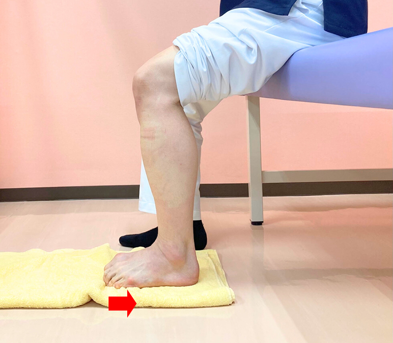 タオルギャザー(足の指でタオルをたぐり寄せる)や、ゴルフボール・テニスボール、ご家庭にあるラップの芯を利用し、足裏で転がしてほぐす方法があります。運動前だけでなく、お風呂上がりもしくは起床時に行うとより効果的です。