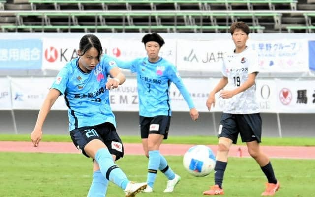 先制のミドルシュートを決めるMF五味小暖=2025年10月5日、甲府市のJITリサイクルインクスタジアム、三宅範和撮影