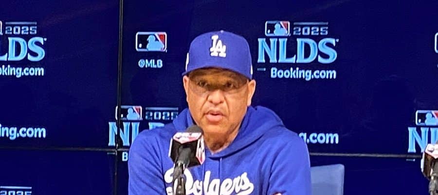 試合前、取材に応じるドジャースのデーブ・ロバーツ監督【写真:真柴健】