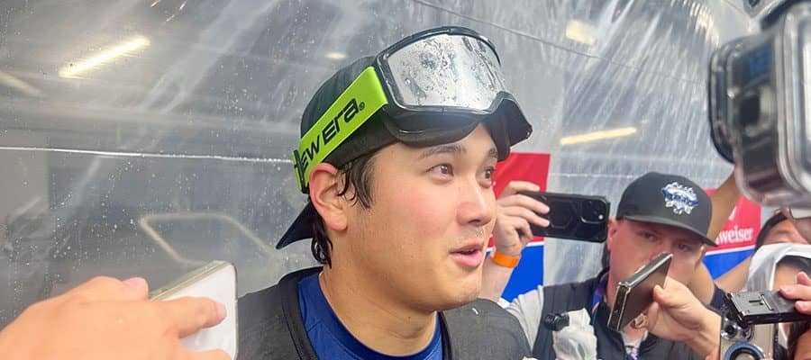 試合後、取材に応じるドジャース・大谷翔平【写真:小谷真弥】