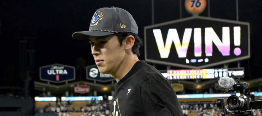 ドジャースは9日(日本時間10日)、本拠地フィリーズとの地区シリーズ第4戦にサヨナラ勝利。シリーズ成績を3勝1敗とし、2年連続での優勝決定シリーズ進出を決めた。試合後に歓喜に沸くナイン。恒例となった集合写真では、“殊勲”の佐々木朗希投手がここでも話題を呼んだ。
