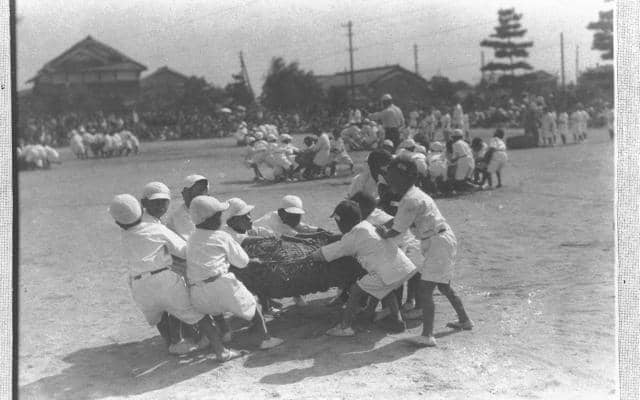 1932年10月、俵引き競争で頑張る尼崎第二尋常小学校の1年生=兵庫県尼崎市