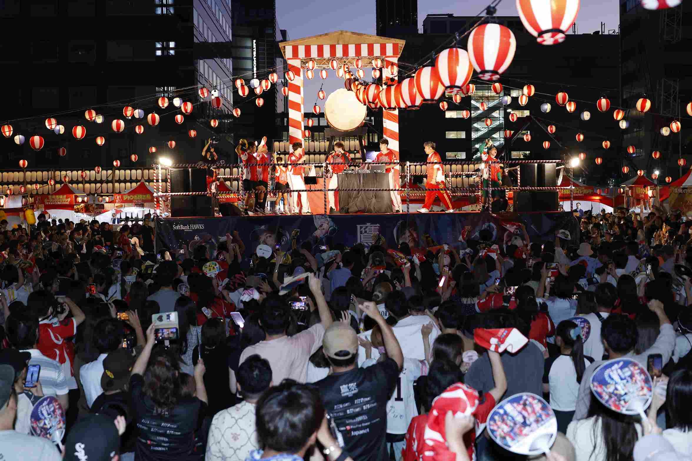 鷹祭 SUMMER BOOSTにおける大きな特徴の一つは、球場から飛び出し街とコラボしていること。「天神夏まつり」と手を組み、会場である福岡市役所西側ふれあい広場からも熱気を発信している。
