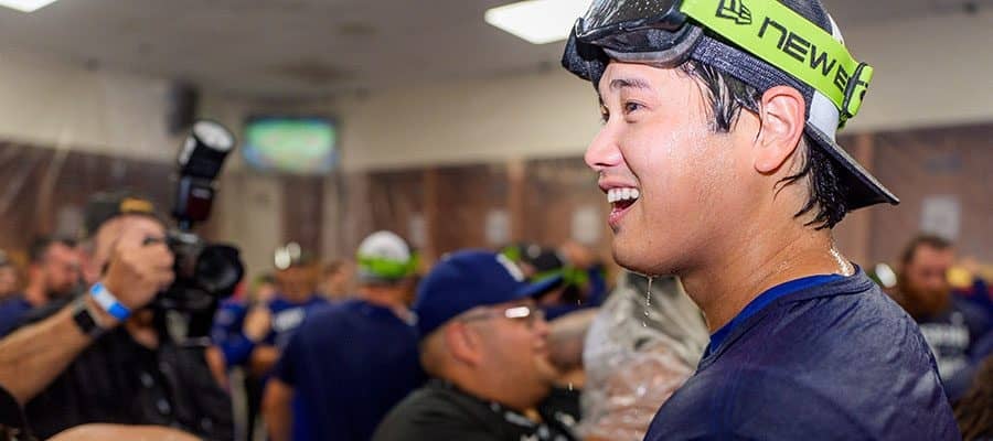 デーブ・ロバーツ監督は「ショウヘイおめでとう」と大活躍の大谷を称えると、選手たちは一斉にシャンパンを発射。びしょ濡れになりながら、歓喜の美酒を味わった。