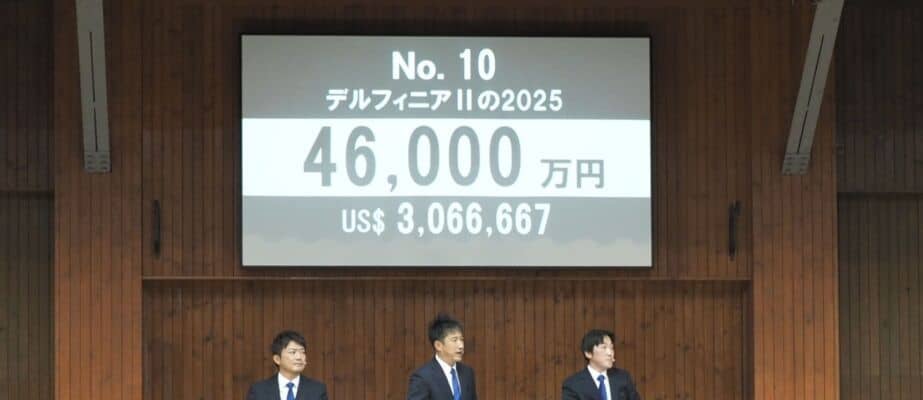 10月21日、北海道苫小牧にあるノーザンホースパークで、「ノーザンファームミックスセール2025」が開幕。当歳馬セッションにて上場番号10番・デルフィニアⅡの2025(牡)が4億6000万円で落札された。