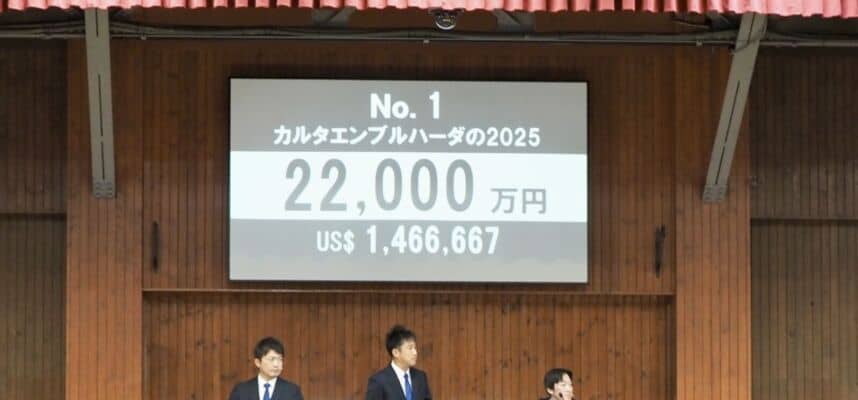 10月21日、北海道苫小牧にあるノーザンホースパークで、「ノーザンファームミックスセール2025」が開幕。当歳馬セッションにて上場番号1番・カルタエンブルハーダの2025(牡)が2億2000万円で落札された。