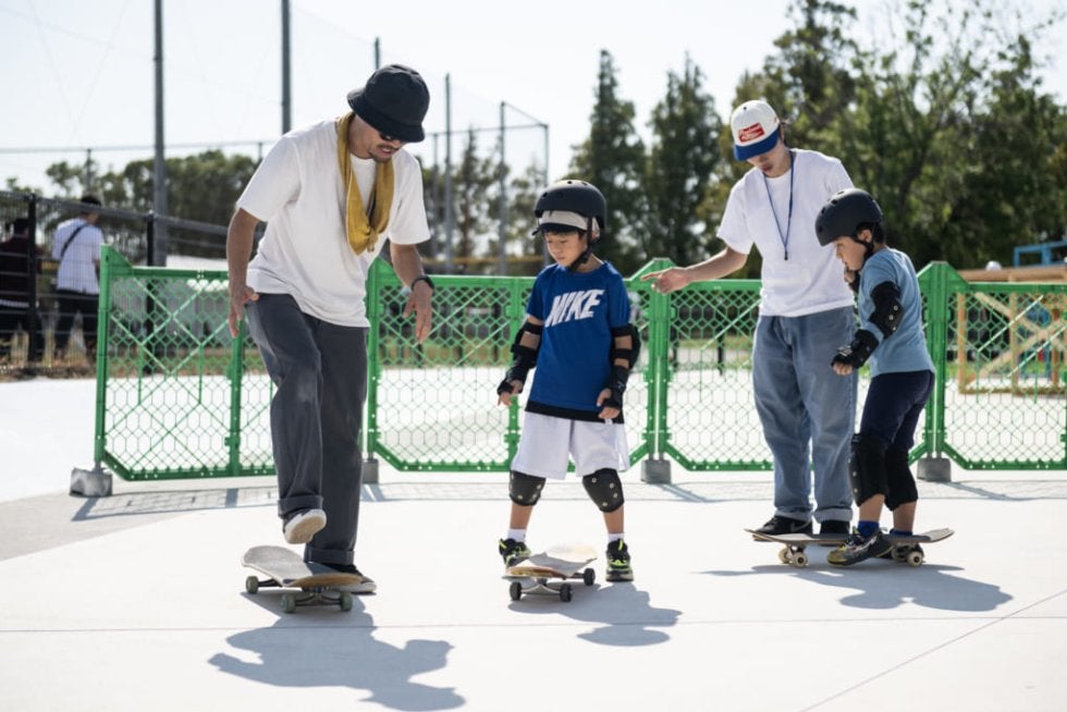 また体験会にも子どもたちを中心に多くの参加者が集まった。初めてのスケートボードにおそるおそるライディングに挑戦する参加者も見られたが、講師陣が手取り足取り一からサポートして指導したことで安全にかつ楽しくスケートボードにトライした。