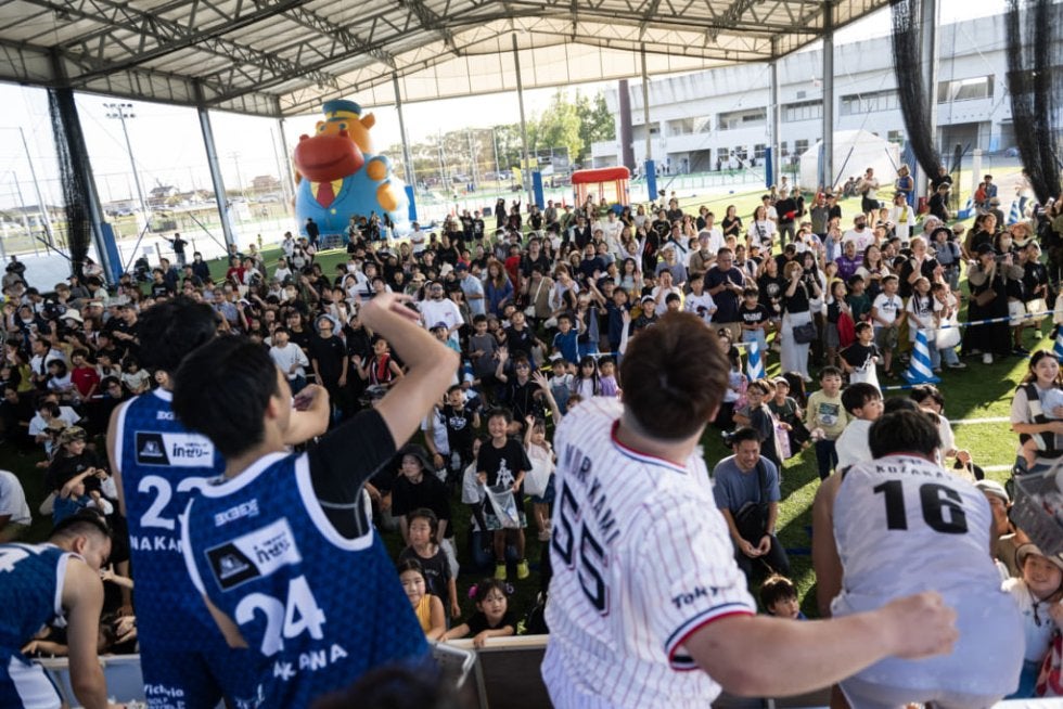 本イベントの開催に先立ちMCのHaruさんの呼び込みの元、宇部市の篠﨑圭二市長の挨拶、そしてイベントをデモンストレーションや体験会で盛り上げるゲスト選手たちやイベント運営を支える来賓の方々が紹介されてメインステージへ登壇すると、山口県の恒例行事である餅まきが行われ、老若男女問わず参加し会場は大盛り上がりの中でイベントがスタートした。