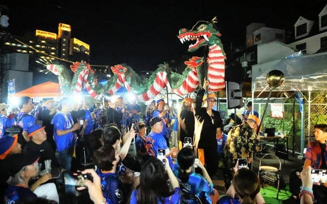 歓喜に沸くピースタを花火が彩った約1時間半後、中心繁華街の夜空にV・長崎の凱歌(がいか)「カンターレ」が響いた。「アディショナルタイムin思案橋」と銘打たれた催しが思案橋横丁会主催で行われ、ユニホームやこの日スタジアムで配られたシャツなどを着た人たちが広場に集結。V・長崎の元選手の大竹洋平さんの音頭で乾杯した。