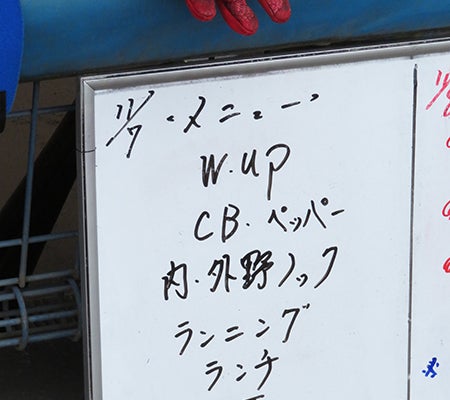 野手側のメニューにも、オヤッ?と思う2文字があった。それが、午後のメニューの合間に記されていた「補食」の文字。そのための時間まで、きっちりと確保してあった。