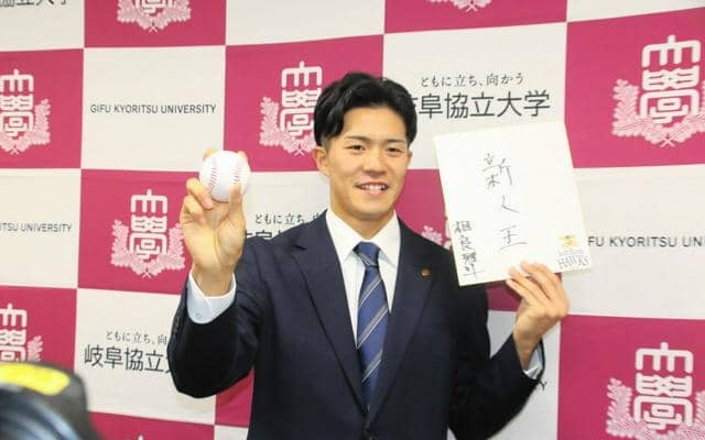 プロ野球のドラフト会議が23日開かれ、岐阜県内では岐阜協立大学(大垣市)の相良雅斗投手(22)がソフトバンクから4位で指名された。大学で記者会見した相良投手は「直球を中心に、カットボールにもこだわっていきたい。新人王をめざす」と喜びを語った。