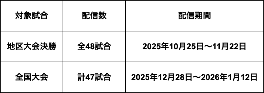 株式会社運動通信社(本社:東京都港区、代表取締役社長 CEO:若村 祐介、以下 運動通信社)とKDDI株式会社(本社:東京都港区、代表取締役社長 CEO:松田 浩路、以下 KDDI)および民間放送43社は2025年10月25日から、第104回全国高校サッカー選手権大会と地区大会決勝におけるライブ動画、アーカイブ動画およびハイライト動画を、運動通信社とKDDIが共同で運営するスポーツメディア「SPORTS BULL(スポーツブル)」の特設ページ(URL:https://sportsbull.jp/highschool_soccer/)で配信します。