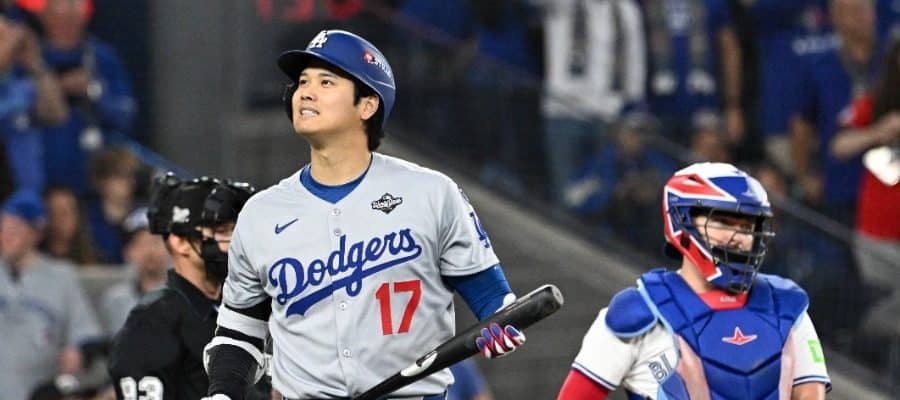 ドジャースの大谷翔平投手は24日(日本時間25日)、敵地で行われたブルージェイズとのワールドシリーズ第1戦に「1番・指名打者」でスタメン出場。第3打席は左腕フルハーティと対するも見逃すも三振となり、天を仰いだ。際どい球に、ファンも「今のは、ボールでしょ?」「ストライクゾーン厳しくない?」など反応した。