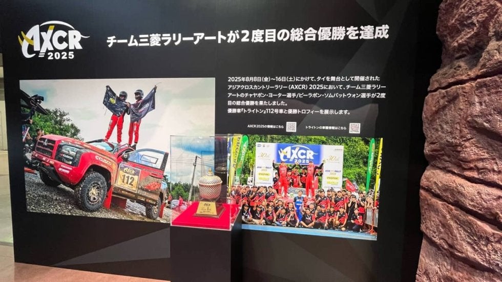 10月29日に東京ビッグサイトで開幕したジャパンモビリティショー(一般公開日:10月31日〜)において、三菱自動車は自社ブースにて2025年のアジアクロスカントリーラリー(AXCR)でチャヤポン・ヨーター/ピーラポン・ソムバットウォンが優勝した三菱トライトン112号車を展示している。